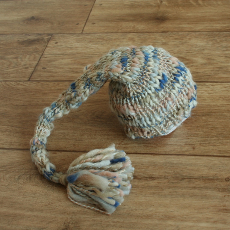 Ručně pletená čepička na focení novozorených miminek z příjemně měkké vlny, pletená beze švu.